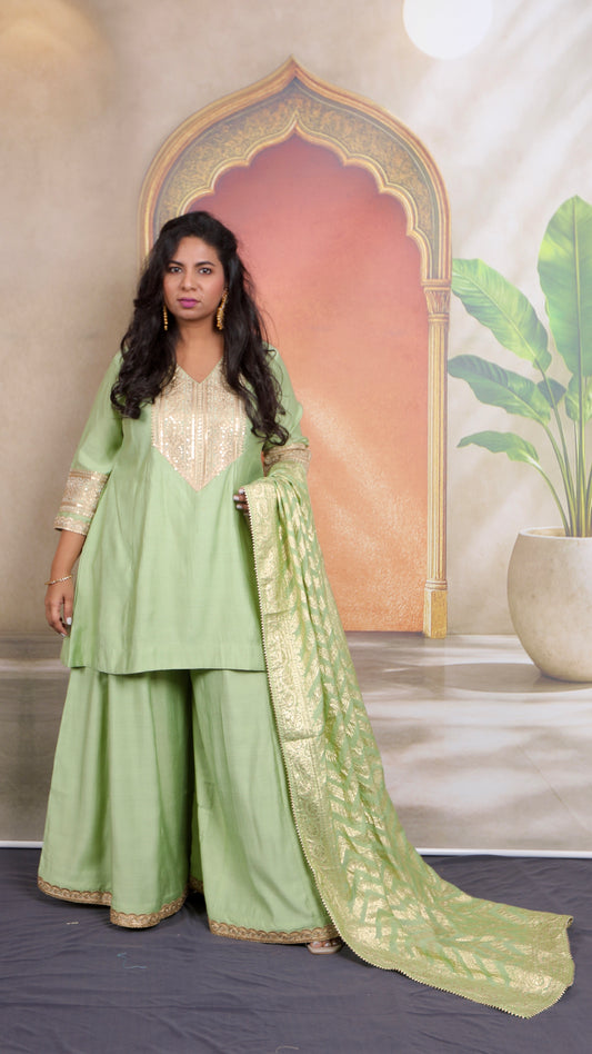 Shanaya - 3 pc set - PISTA GREEN - Crape silk + Zari Dupatta