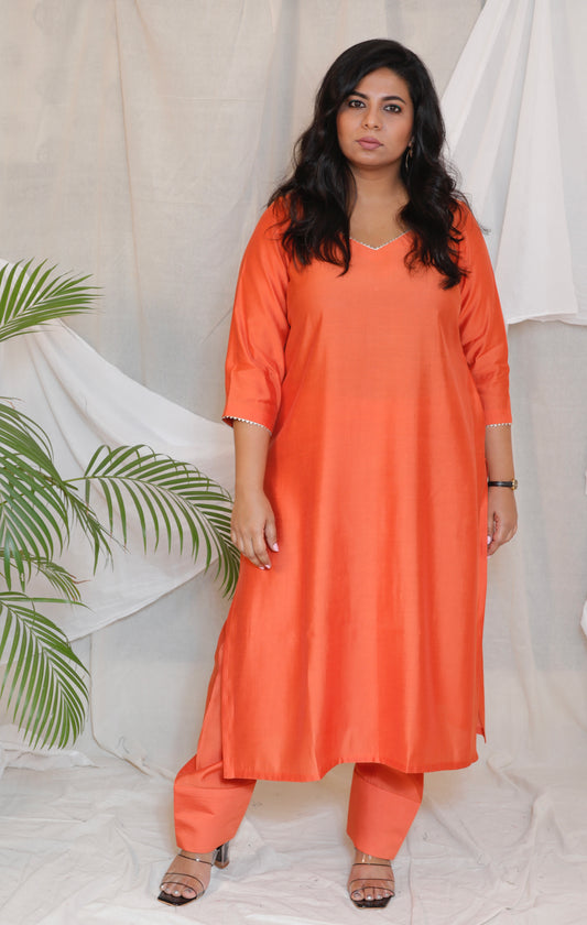 RANI - 3pc Crape Silk Kurta with Pajama Pant and Dupion silk dupatta- CORAL ORANGE