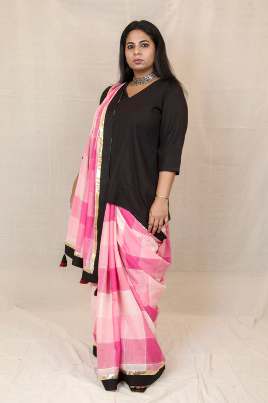 RIDHI - Mul Mul Cotton Saree - Pink Checks+ Kurti Optional