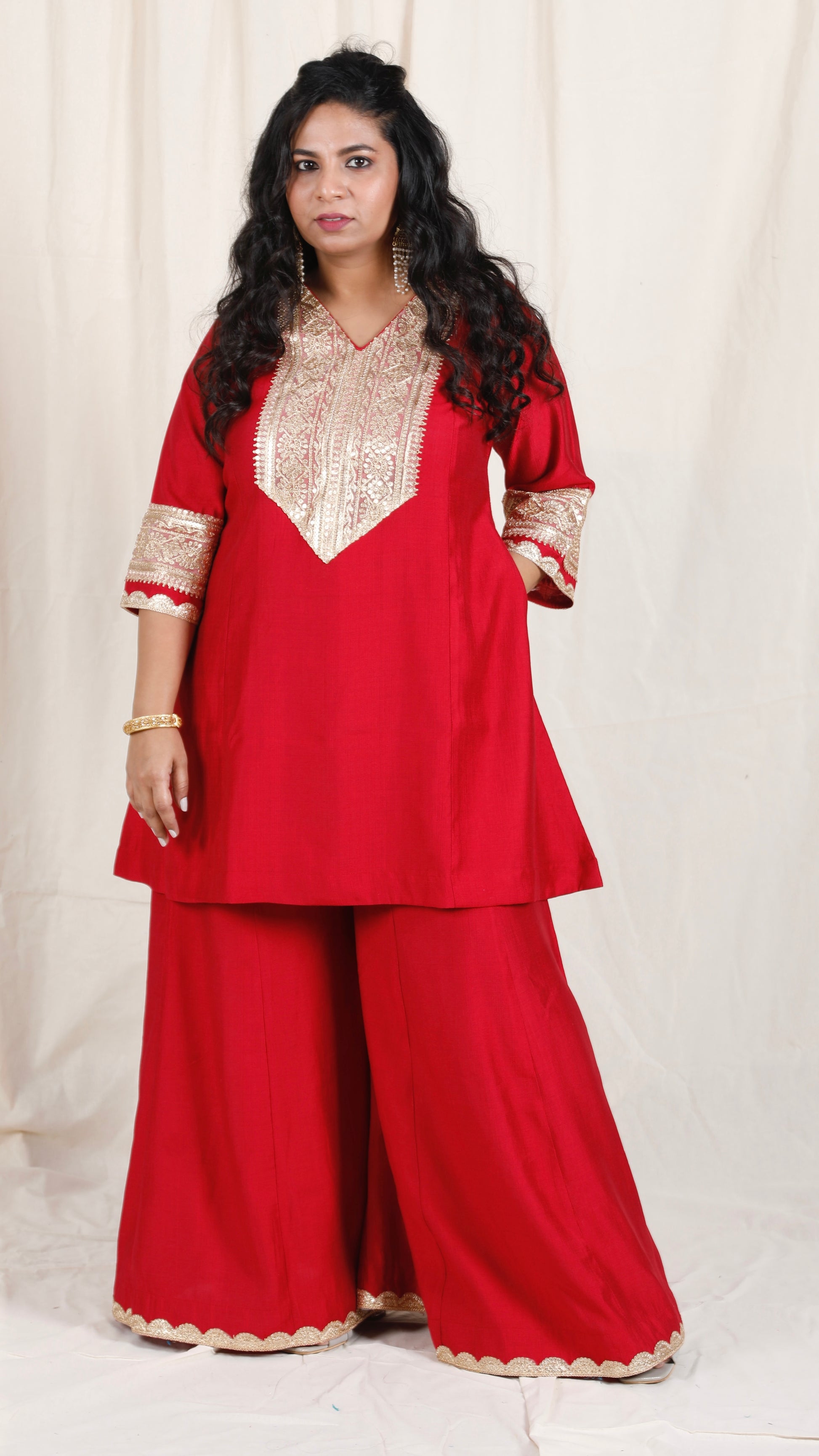 Shanaya - 3 pc set - RED - Crape silk + Zari Dupatta